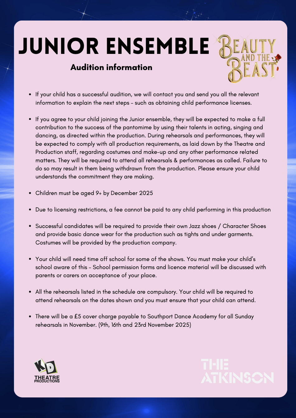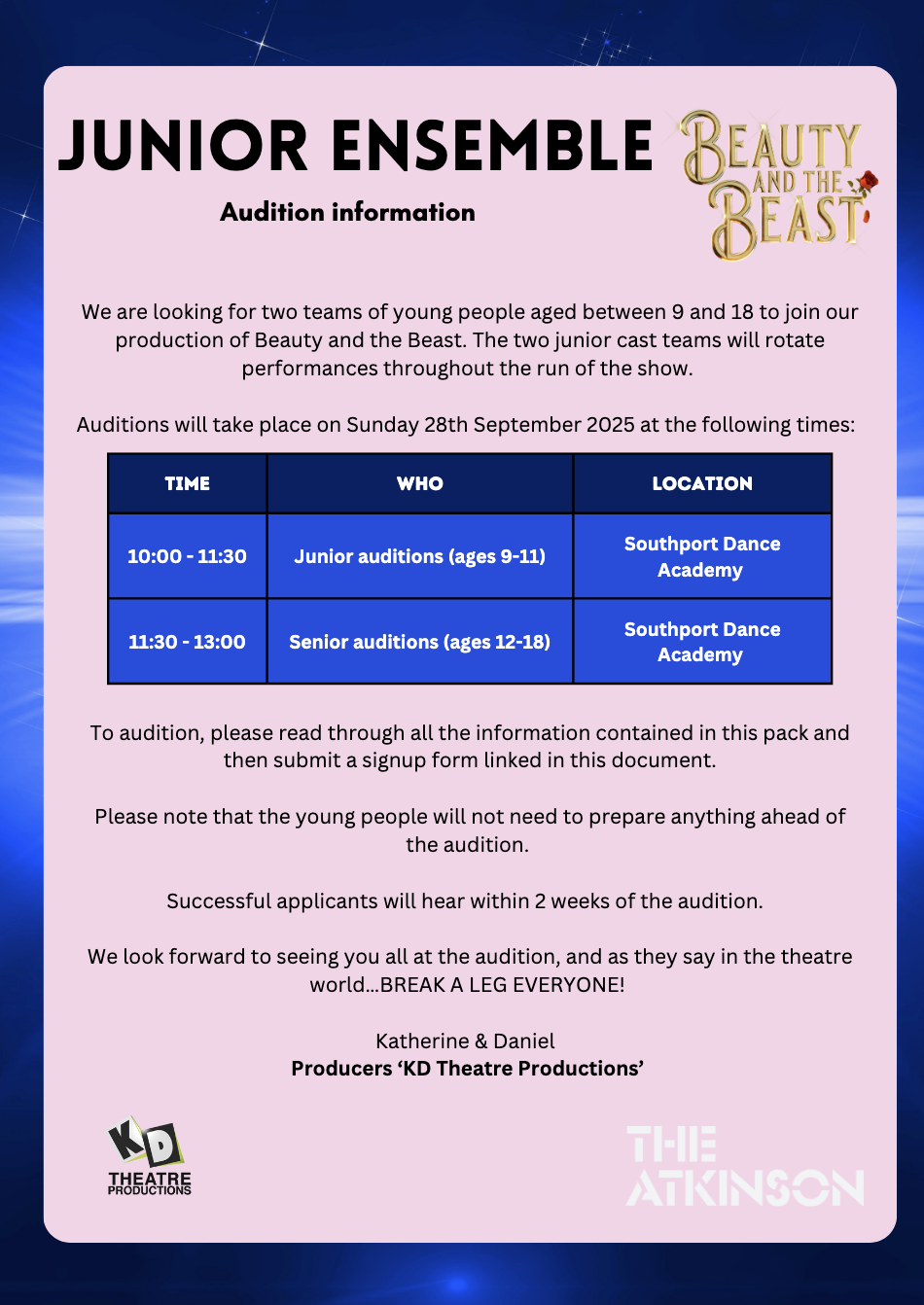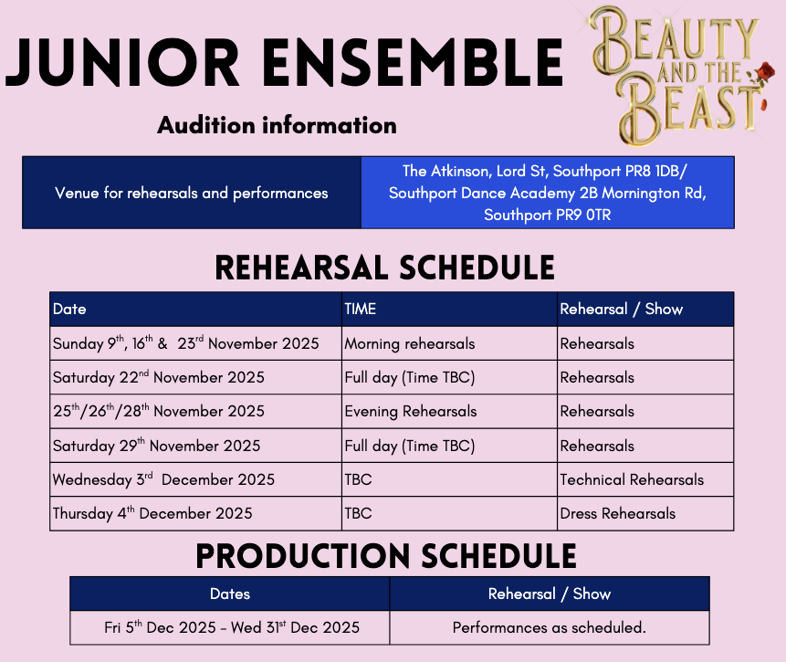 KD Theatre Productions are looking for two teams of young people aged between 9 and 18 to join their production of Beauty and the Beast. Auditions will take place on Sunday 28th September 2025.