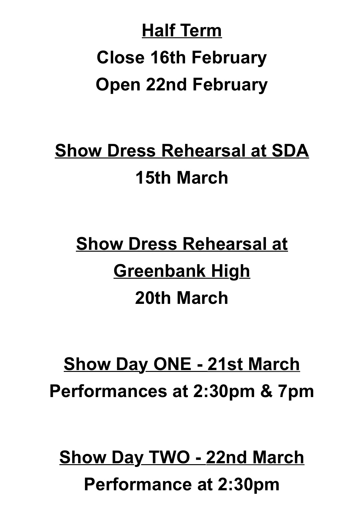 We are rapidly approaching ‘Show-Time’! This year the show is called ‘CELEBRATING 30 YEARS’ and will be held at Greenbank High School on Saturday 21st March (two performances) and Sunday 22nd March (one performance). There will be two rehearsals, the dress rehearsal on Sunday 15th March (at the studio) and the technical rehearsal on Friday 20th March (at Greenbank).